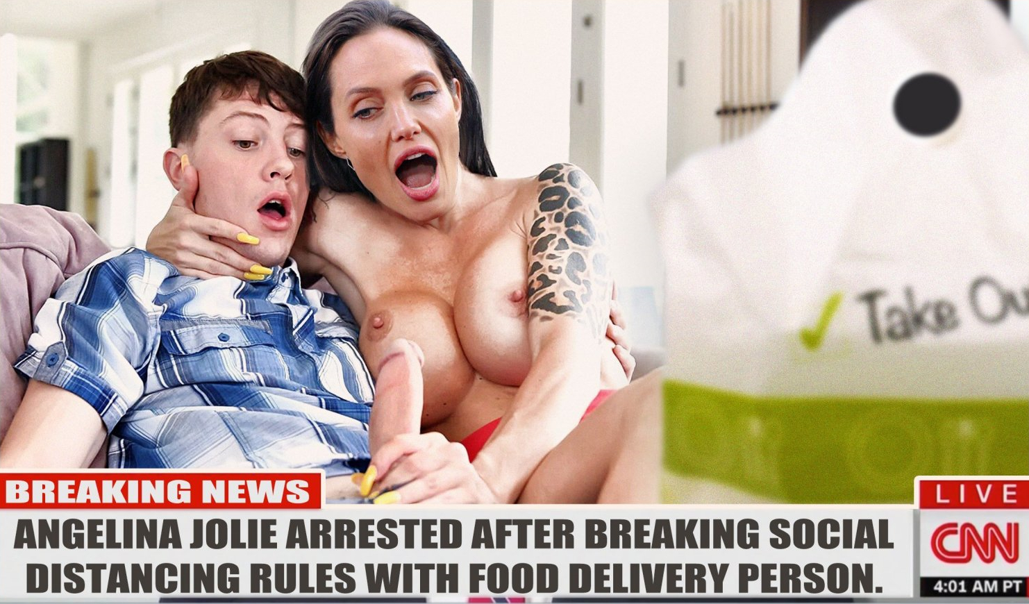 Mature slutty Angelina Jolie seduced a young boy, jerking off and sucking his erect dick.